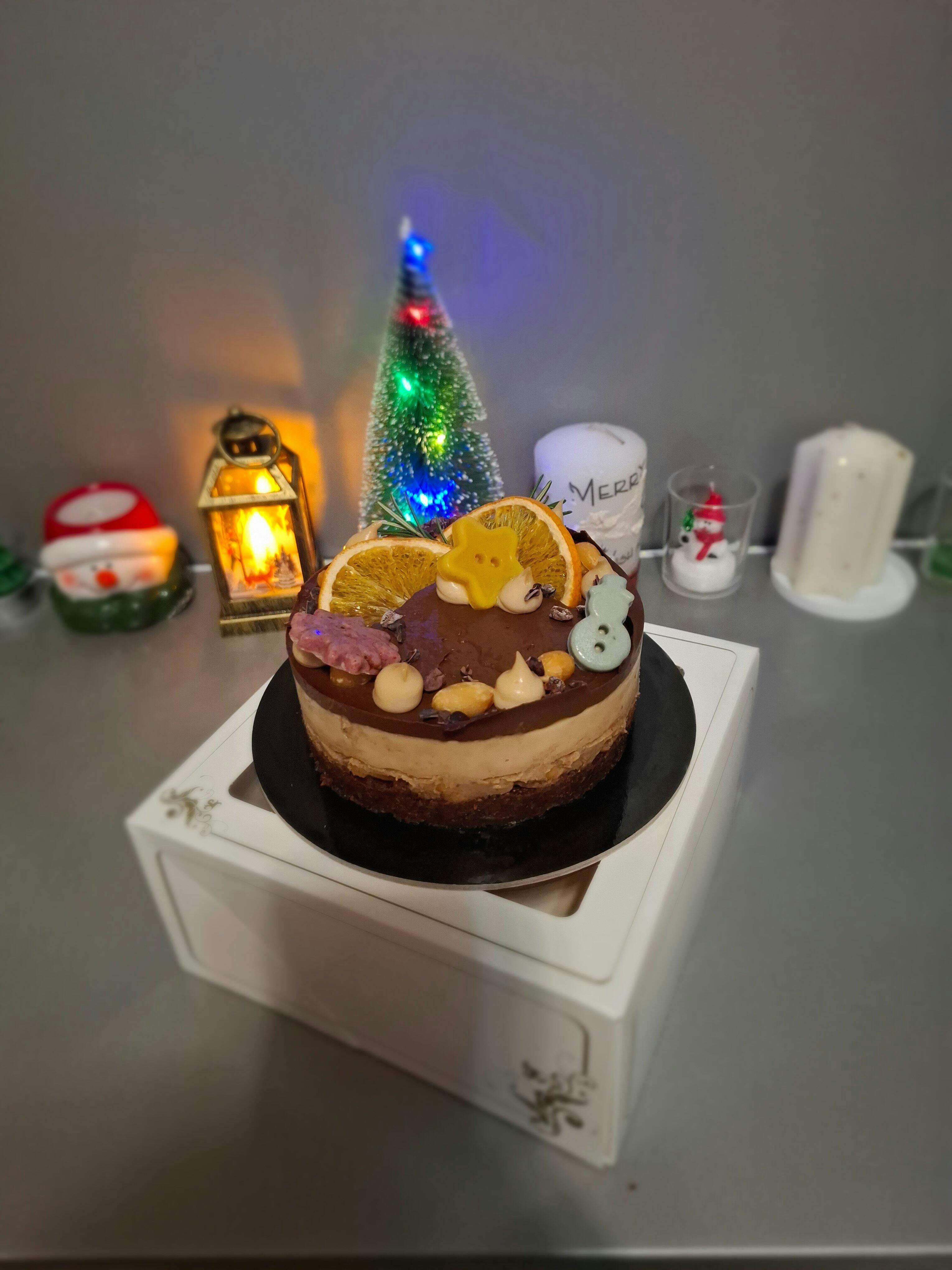 Декорацията от сушени портокалови резени, печени фъстъци, какаови зърна, ръчно изработени шоколадчета и свеж розмарин превръща всяко парче в истинско гурме преживяване — наситено, многопластово и запомнящо се.